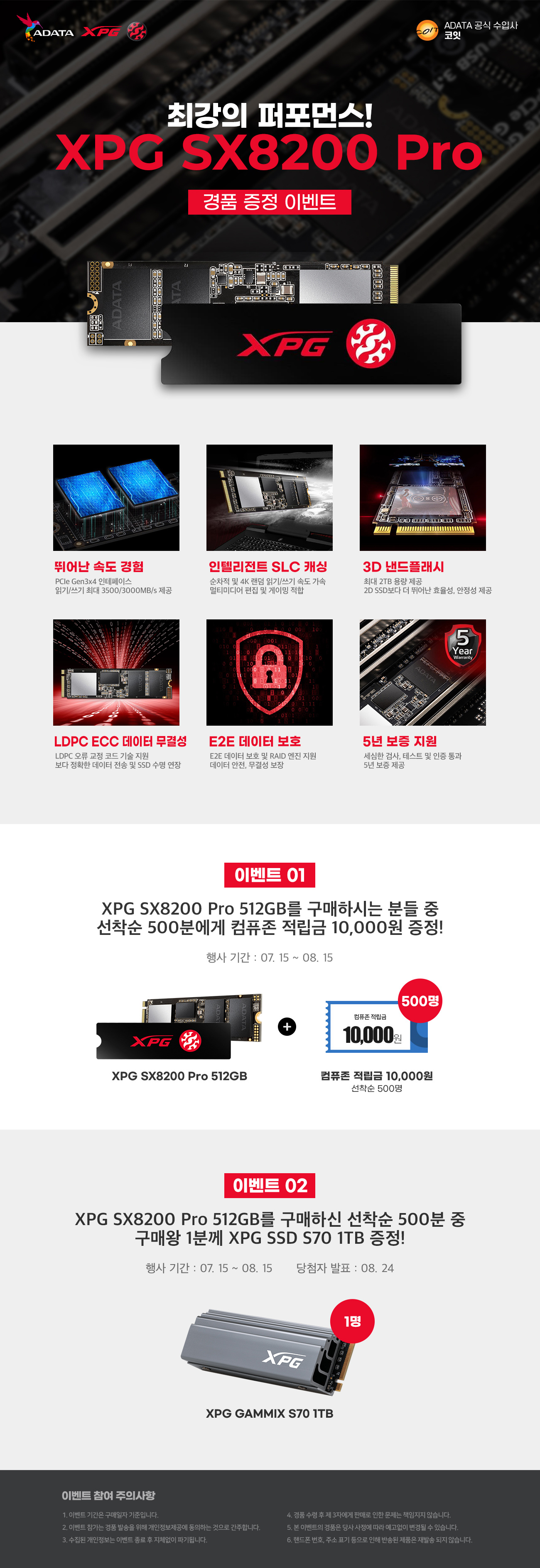 8월 15일까지 진행하는 이번 이벤트는 코잇이 유통하는 ADATA XPG SX8200 Pro NVMe 512GB를 컴퓨존에서 구매하는 고객을 대상으로 선착순 500명에게 컴퓨존 적립금 10,000원을 증정한다. 추가로 이벤트로 선착순 500명 중 구매왕 1명을 선정하여 ADATA XPG GAMMIX S70 M.2 NVMe 1TB를 증정한다. 이번 이벤트에 대한 자세한 정보는 컴퓨존에서 확인할 수 있다.
