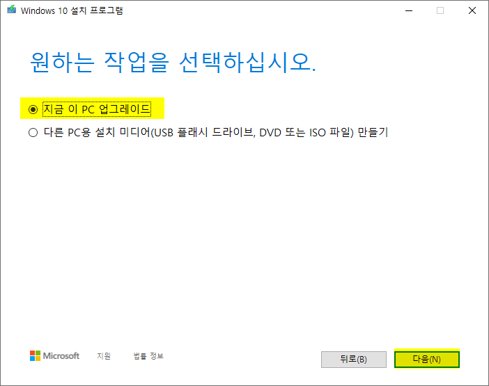 3. 원하는 작업을 선택하라고 하면... [ 지금 이 PC 업그레이드]를 선택하면 된다.