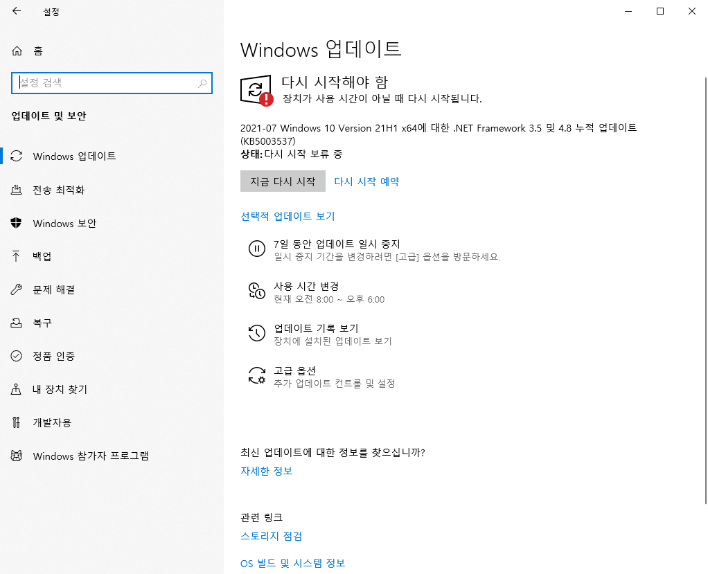 9. 오랜 시간이 흐른 뒤 다시 윈도우 업데이트 화면에 진입을 해 보면, 누적 업데이트 등에 관한 사항은 없었다.
