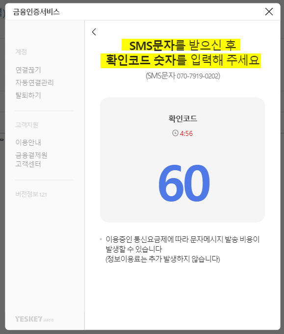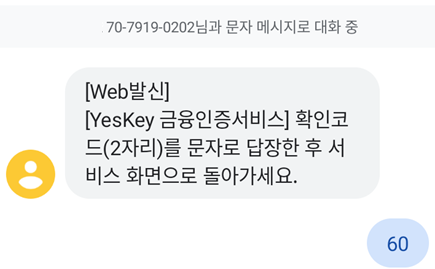 화면에 보이는 코드를 은행으로부터 문자를 받으면 60을 입력하고 발송하면 된다.