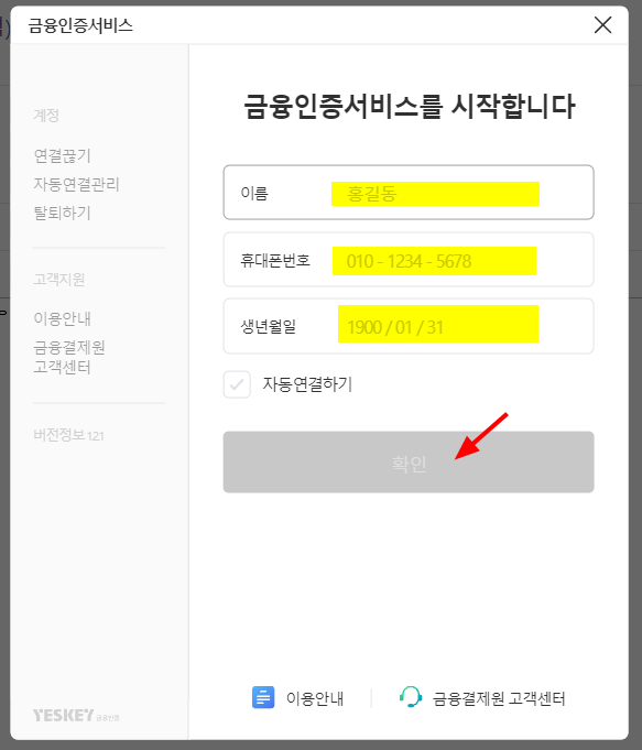 7. 창이 뜨면서 이름 / 휴대폰 번호 / 생년월일 을 입력하고 [확인] 버튼을 누른다.
