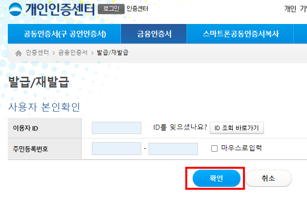 3. 사용자ID, 주민등록번호도 물어본다. 기존 인증서 발급과 비슷하다.