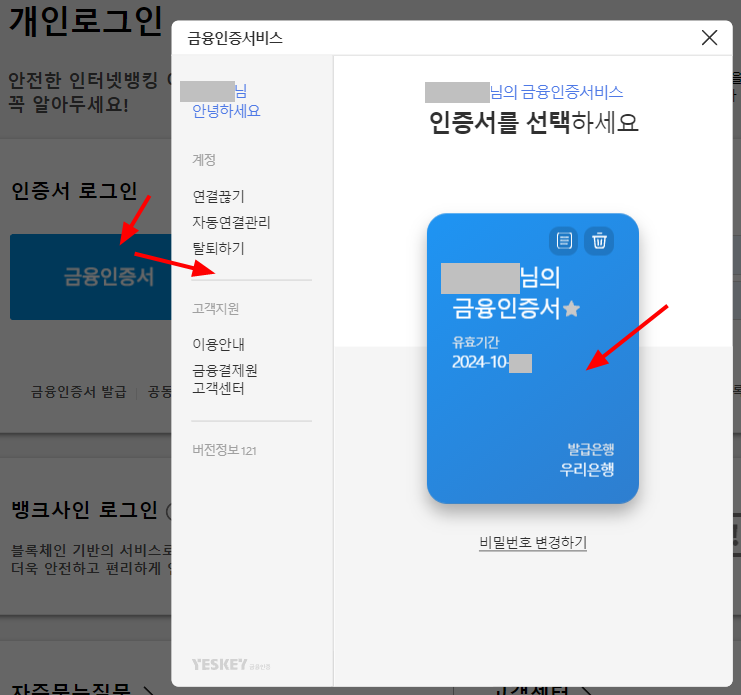 13. 우리은행을 금융인증서를 클릭해 로그인하려고 하면 아래처럼 파란색을 클릭해서 암호 입력하고 로그인 하면 된다.