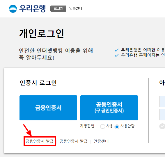 1. 일단은 똘82닷컴은 우리은행을 주로 쓰고 있기에 우리은행으로 접속하여 로그인 창에 금융인증서 버튼 밑에 [금융인증서 발급]이라고 링크가 보일 것이다. 클릭해서 들어가 보자.