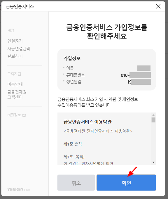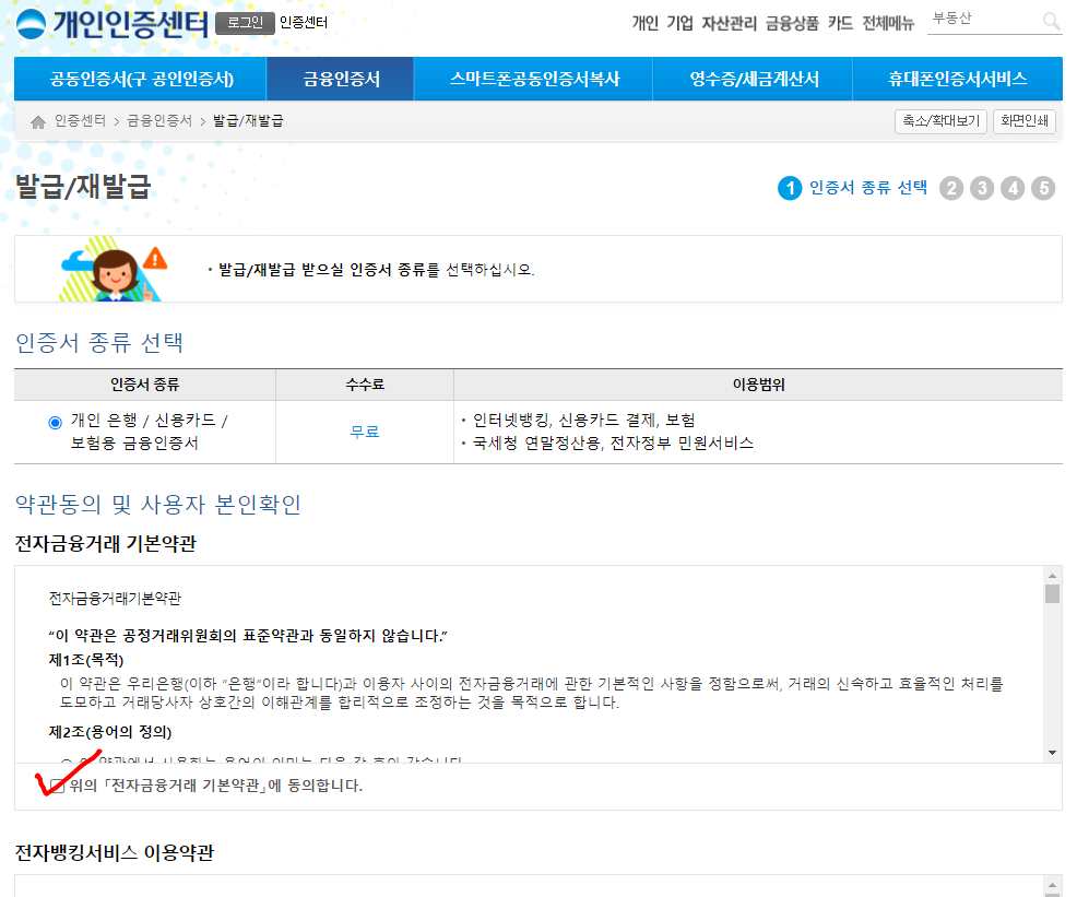 2. 금융인증서 발급 메뉴에서 처음 약관들에 대해서 체크를 하고 확인하자.