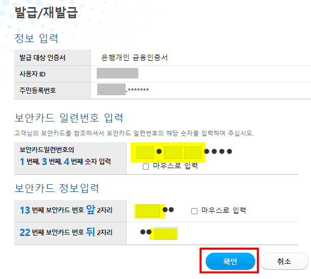 4. 그리고 보안카드 정보를 묻기에 적절하게 입력을 해 주면 된다.