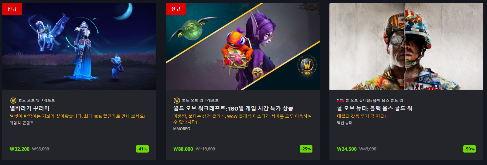 디아블로2부터 월드 오브 워크래프트, 콜 오디 튜티 등 여러가지 게임들이 할인 중이다.