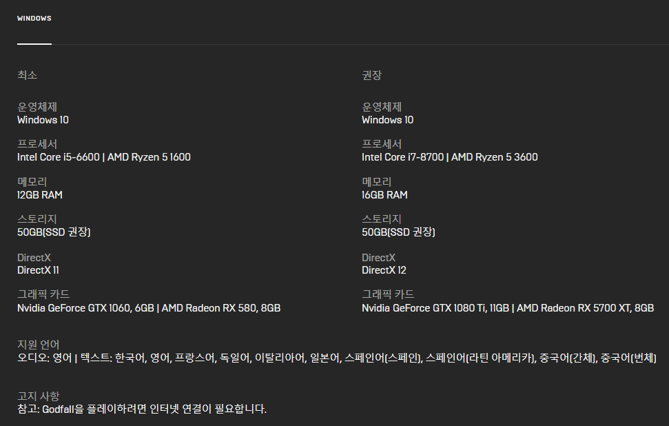 Godfall Challenger Edition 는 한국어를 지원하며 최근에 나온 게임이라서 그런지 50G 의 용량 및 CPU 사양이 높은 편이다. 또한 한국어를 지원해서 한국 사람들도 편히 게임을 즐길 수 있다.