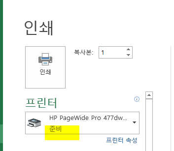 그런 뒤에 인쇄 메뉴로 들어가 보면, 프린터 오프라인은 사라지고 '준비' 상태로 돌아옴을 확인 가능하다.