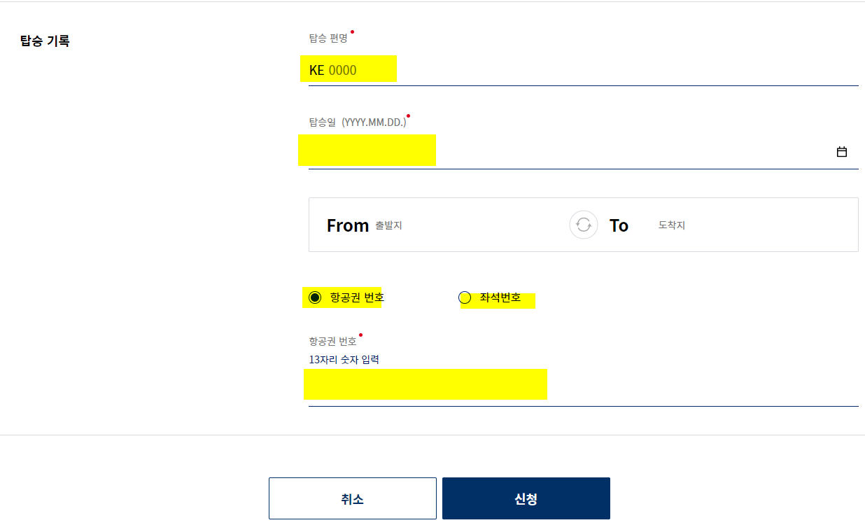 만약 비행기를 여러 번 탑승했다면(편도) 라면 각각 별도로 입력을 해 주면 된다. 건건이 1개씩 입력을 해 주면 된다는 뜻이다.