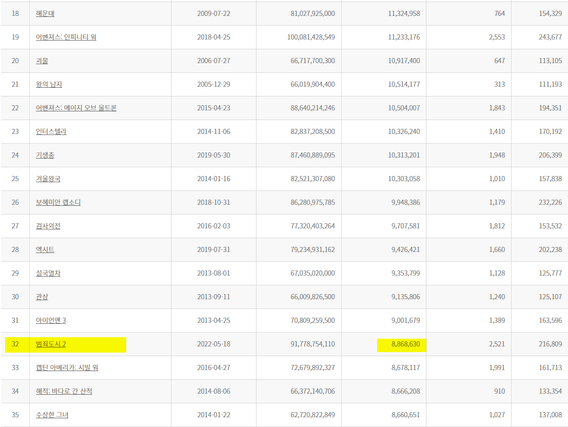 범죄도시2 순위는 32위 이지만 계속 상승 중이다. 아바타 정도의 기록은 꺨 수 있을 거으로 보이는데...