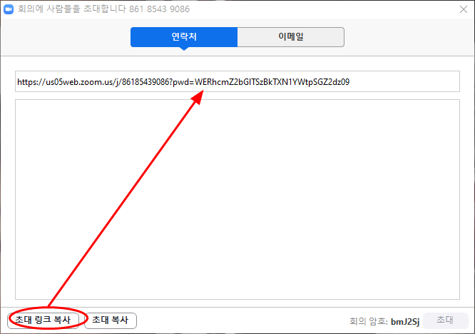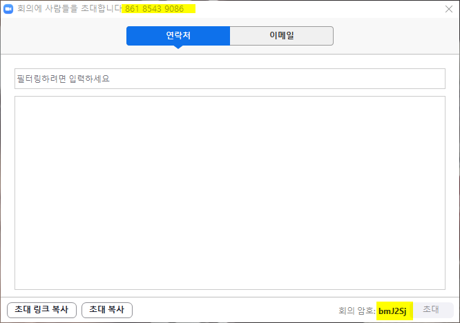 맨 위에 줄에 861 8543 9086 이 회의방 번호(주소)이며, 오른쪽 하단이 회의방 비밀번호가 나온다.