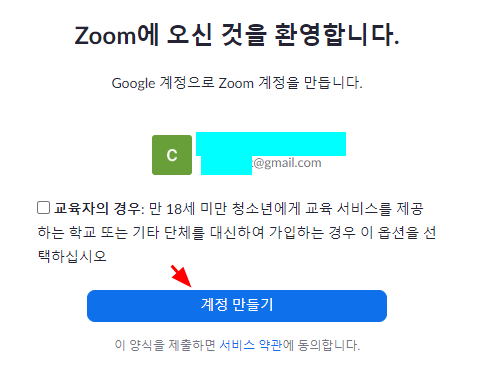 6. 다음 단계로 가면 zoom 계정을 만든다고 안내가 나온다. 교육자일 경우는 체크를 해서 만들어도 되며, 일반적으로 체크없이 계정 만들기 버튼을 누르자.
