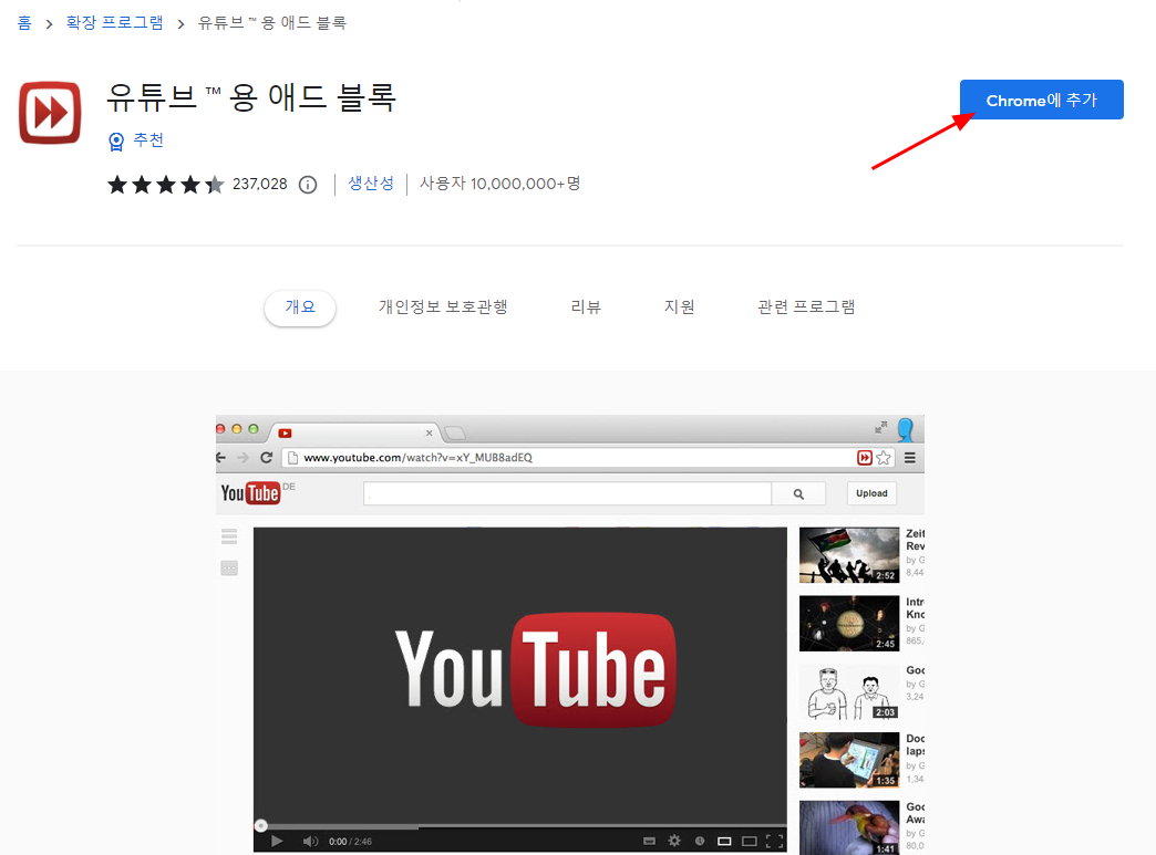 2. 크롬 웹 스토어에서 애드블록 이라고 검색을 하자. 3개정도 프로그램이 나오는데 추천으로 되어있는 유튜브용 애드 블록을 클릭하면 된다. 가장 많이 다운 받은 처음 것을 선택하자.