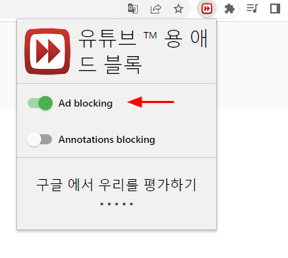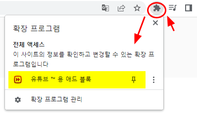 6. 크롬 웹브라우저 오른쪽에 조각맞추기 아이콘을 클릭하면 유튜브용 애드블록 프로그램이 설치된 것을 확인 가능하다.