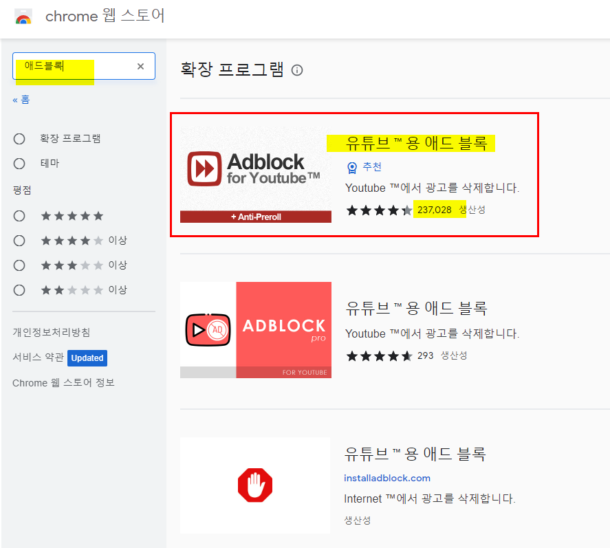 2. 크롬 웹 스토어에서 애드블록 이라고 검색을 하자. 3개정도 프로그램이 나오는데 추천으로 되어있는 유튜브용 애드 블록을 클릭하면 된다. 가장 많이 다운 받은 처음 것을 선택하자.