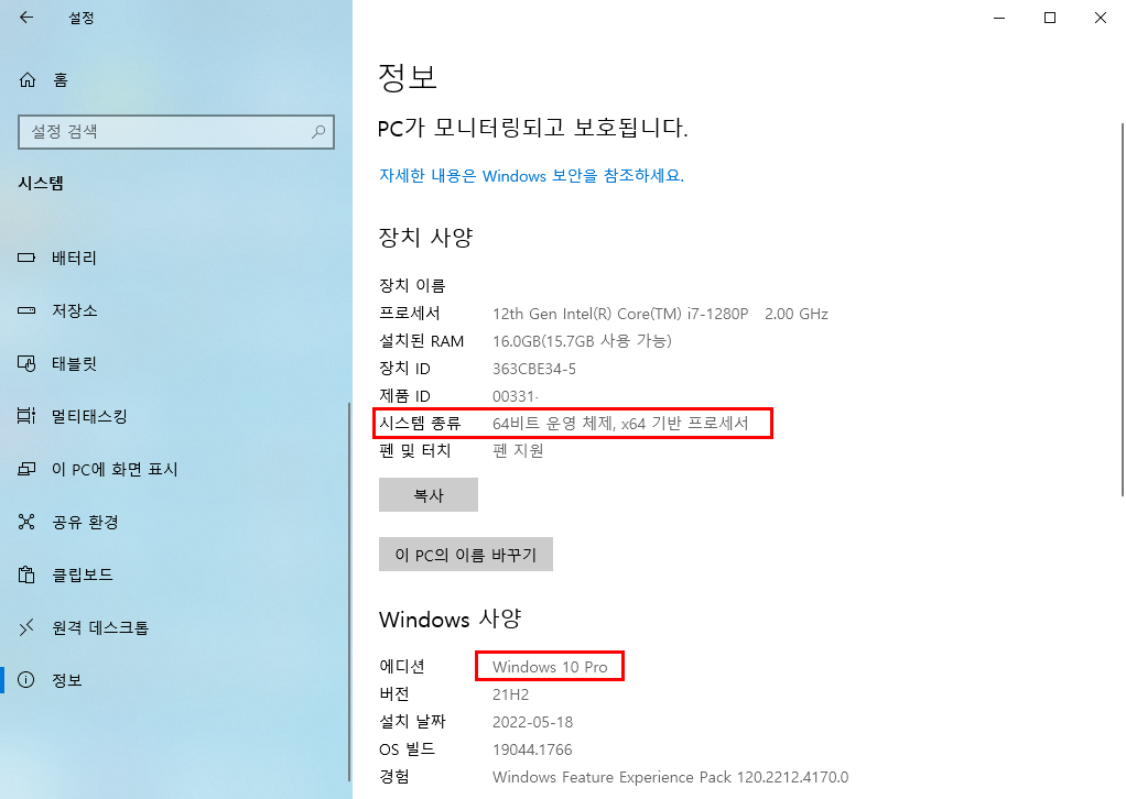그리고 윈도우10 Pro 버전 21H2 를 현재 사용중이라는 것이 확인 가능하다.