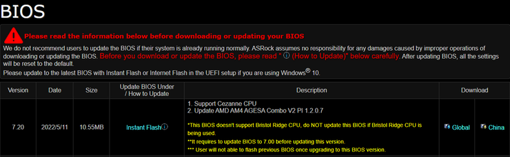 애즈락 A320 최신 바이오스는 애즈락 홈페이지의 각 제품 페이지의 바이오스 탭에서 다운로드 받을 수 있다. 기존 사용자 중 메인보드의 바이오스 버전이 7.00 미만일 경우 7.00 바이오스를 먼저 업데이트한 후 최신 7.20 바이오스를 업데이트해야 정상적으로 사용이 가능하다.