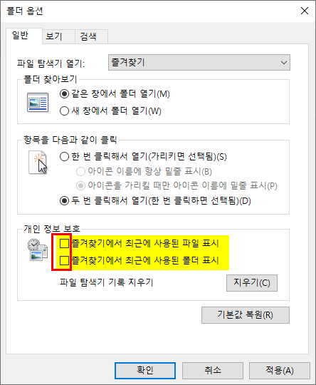 5. 만약 즐겨찾기에 파일이나 폴더를 표시하고 싶지 않다면, 폴더 옵션에서 개인정보 란의 체크를 해제해 준다.