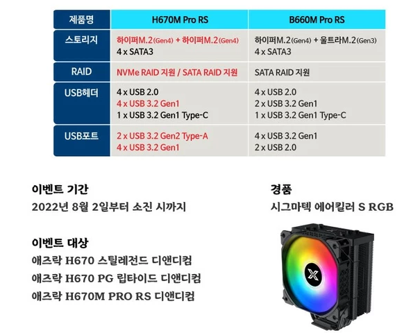 혁신적인 기술로 글로벌 PC DIY 마켓을 리딩하는 애즈락(ASRock) 메인보드, 그래픽카드 유통사 디앤디컴(대표: 여인우, 이하 디앤디)은 최고 64Gbps 하이퍼 M.2 슬롯을 전라인업 2개 이상 탑재했으며 더 빠르고 더 많은 USB 포트를 지원하는 애즈락 H670 메인보드 구매 시 시그마텍 에어킬러 S RGB 쿨러를 1:1 증정하는 이벤트를 진행한다.