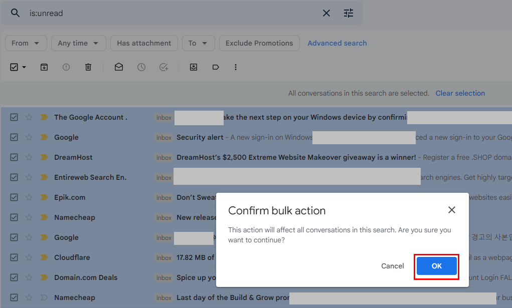 똘82닷컴과 구글 지메일(gmail.com)에서 많은 읽지 않은 메일들을 일괄 읽음 상태로 변경하는 방법을 알아보자.