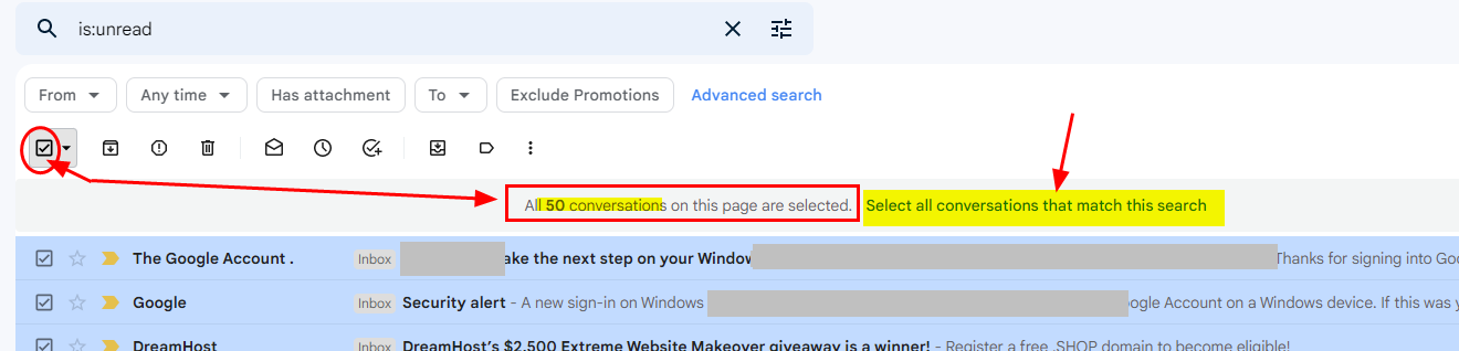 2. 전체 체크를 해 주자. 그러면 50개 메일이 선택되었다고 메세지가 나온다. All 50 conversations on this page are selected.