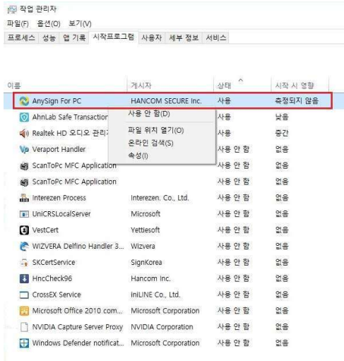 2. 시작프로그램에서 AnySign For PC 사용 안 함으로 되어있는 경우 사용으로 변경