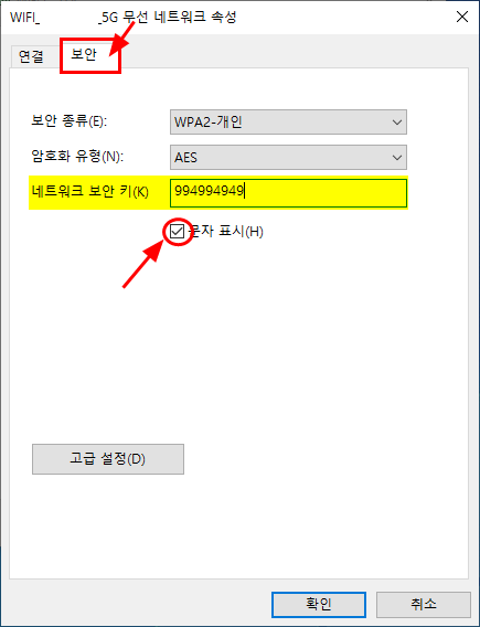 6. 보안 탭을 선택하고, 문자 표시에 체크 표시를 하면 네트워크 보안 키에 우리가 원하던 와이파이 비밀번호를 확인 가능하다.