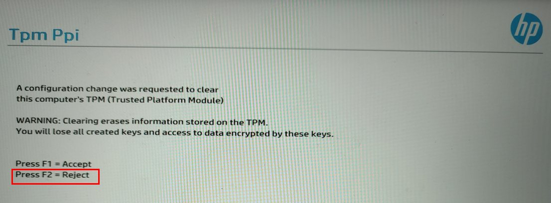 8. TPM PPI가 나올 경우, F2 Reject 을 눌러서 관련 정보는 리셋하지 않도록 하자.