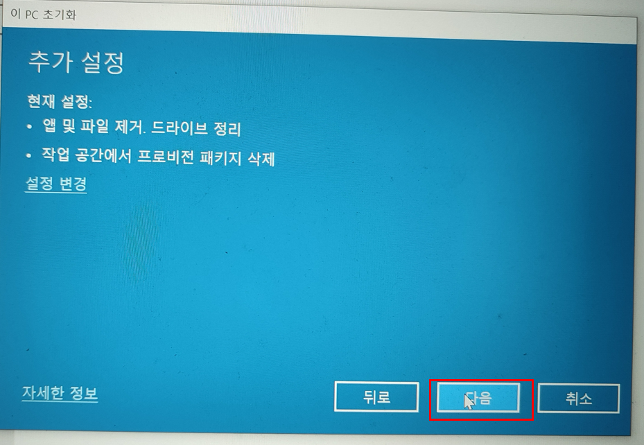 다시 말하지만 윈도우 초기화 전에 중요한 자료는 반드시 별도 usb나 클라우드 저장소에 저장을 하고 진행하는 것을 잊지 말자.
