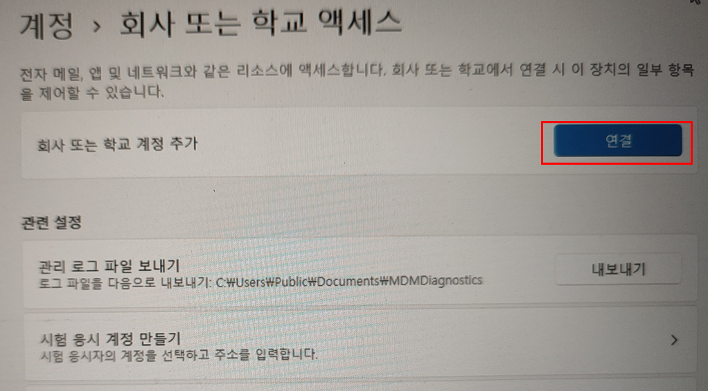 7. 그런 다움 회사 또는 학교 계정 추가에서 [연결]을 눌러주자.