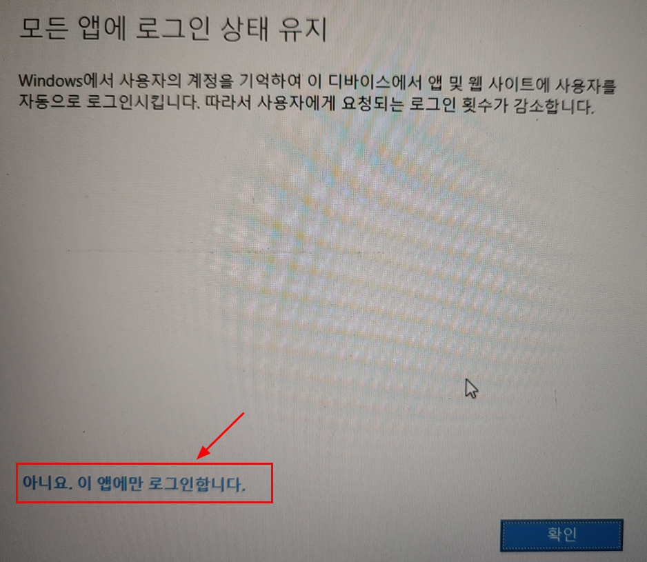 10. 모든 앱에 로그인 상태 유지 창이 나오면 예를 눌러도 되지만, [아니오 이 앱에만 로그인합니다]를 선택해 주는 것이 좋다.