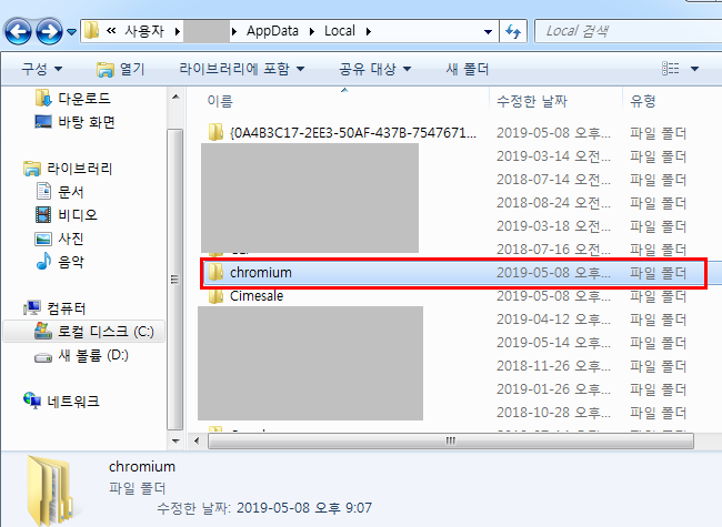 C:\Users\사용자명\AppData\Local 폴더를 들어가면 아래와 같이 chromium 폴더가 보인다.