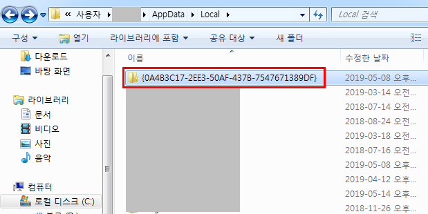 5. 그런 뒤 C:\Users\사용자\AppData\Local 위치 그대로 위에 {0A4B3C17-2EE3-50AF-437B-7547671389DF} 등 이상하게 쓰여진 폴더가 보인다.