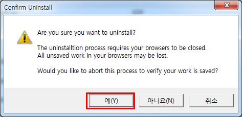 3. 좀 기다리면 이렇게 언인스톨 여부를 묻는 창이 뜨는데, Y를 눌러도 도통 반응이 없다.