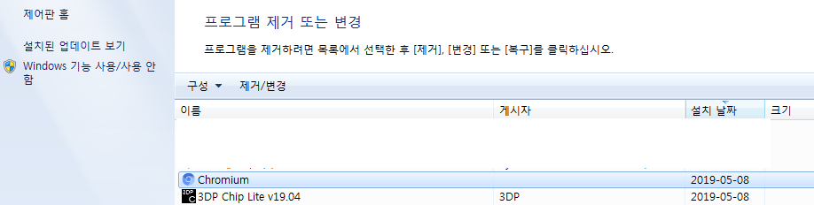 2. 제어판 - 프로그램 제거 또는 변경에서 크로미움을 삭제 해 보았다. 여러번...