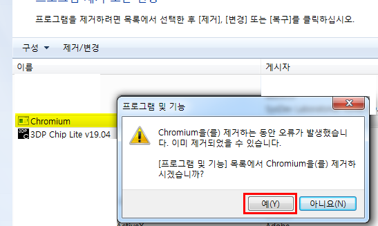 [프로그램 및 기능] 목록에서 Chromium을 제거하시겠습니까?