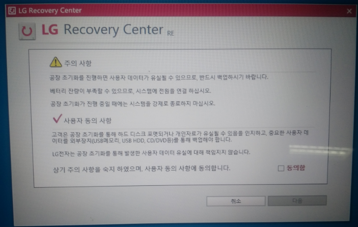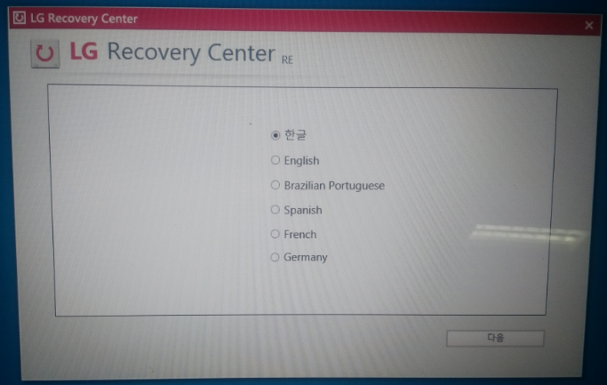 그러면 아래와 같이 LG Recovert Center 화면이 나온다. 언어는 한글으로...