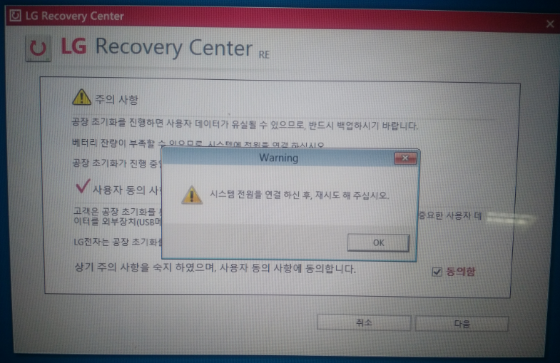 3. 만약 똘82닷컴처럼 노트북 전원이 충분하지 않으면 이렇게 전원 연결하고 진행하라는 문구가 나온다.
