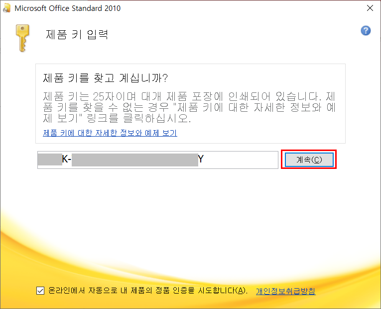 2. MS오피스 정품 제품키를 입력해 준다. [계속]