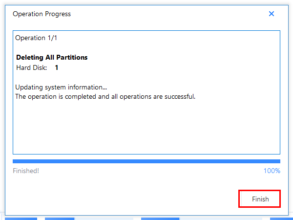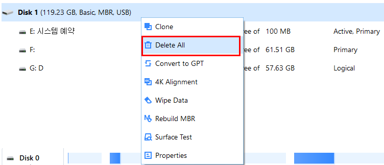 2. DISK 1에 오른쪽 마우스를 클릭 >> [DELETE ALL]을 선택한다.
