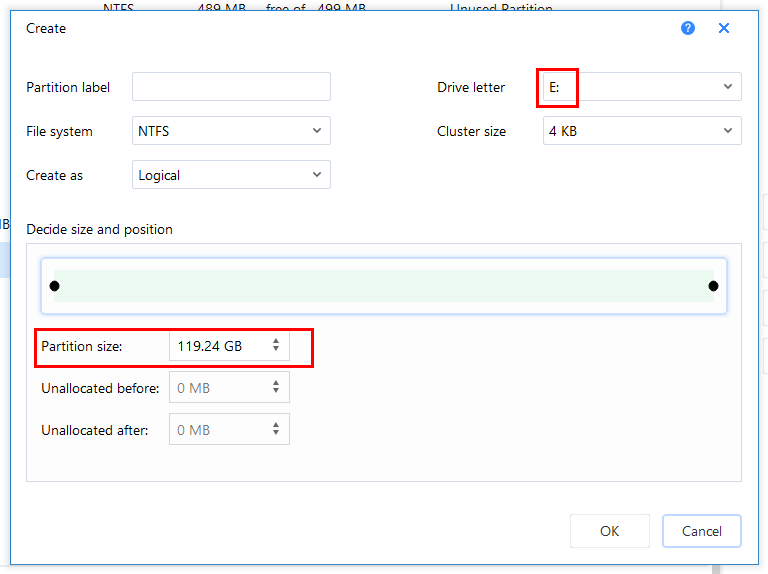 9. 드라이브명 및 파티션 크기를 조절할 수 있는 창이 나오나, 여기서는 100% 다 사용하기에 그대로 [ok]