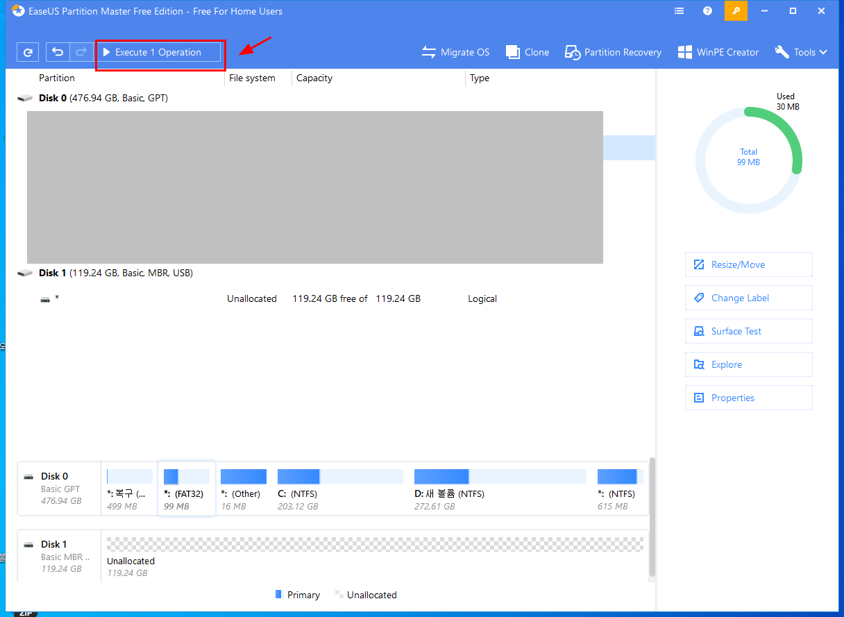 10. 그러면 또 왼쪽 위로 뽀로롱~ [> Excute 1 Operation] 이 활성화된다.