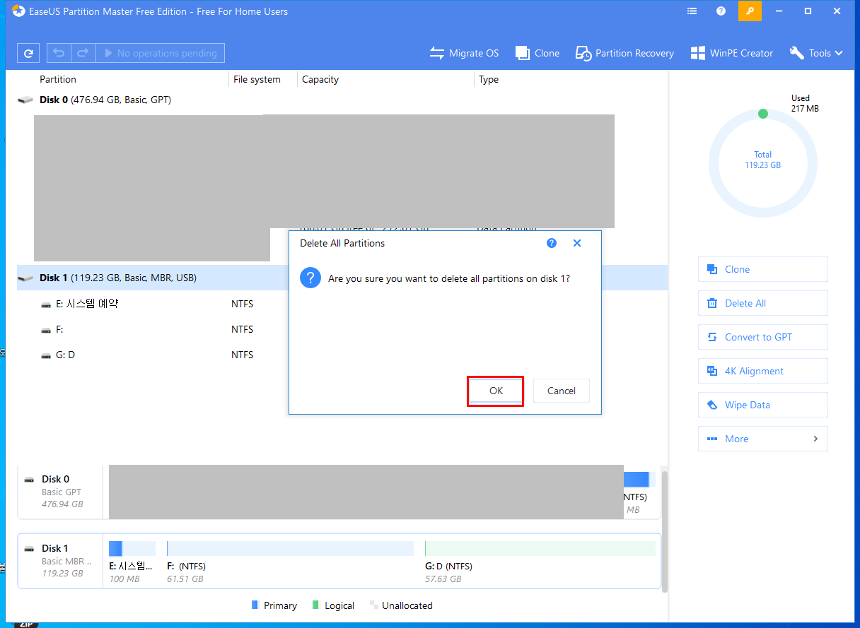 3. 전체 파티션을 삭제할꺼냐는 경고 창이 나온다. [OK]