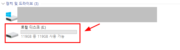 신규 드라이브 E가 전체 용량으로 생긴 것이 보인다.