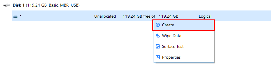 DISK 1 에 오른쪽 마우스 >> [Create]를 선택