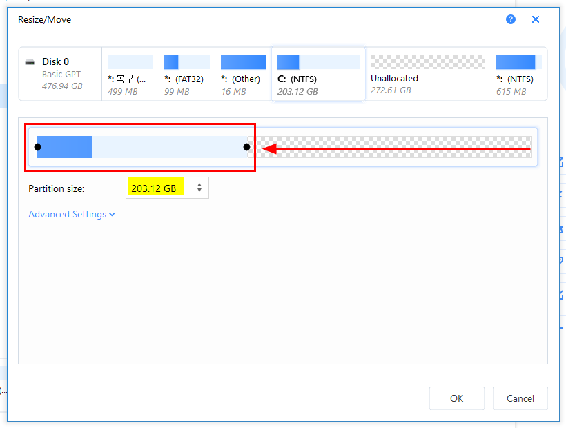 그러면 이렇게 현재 C드라이브 크기를 203GB 정도로 하겠다고 조절하였다. [OK] 클릭