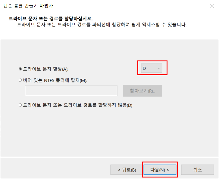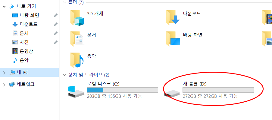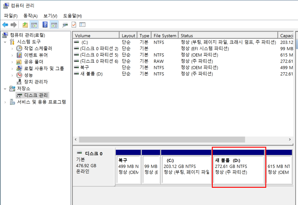 EPM을 사용하지 않고 윈도우를 활용해서 나머지 D드라이브를 만들어 보자.