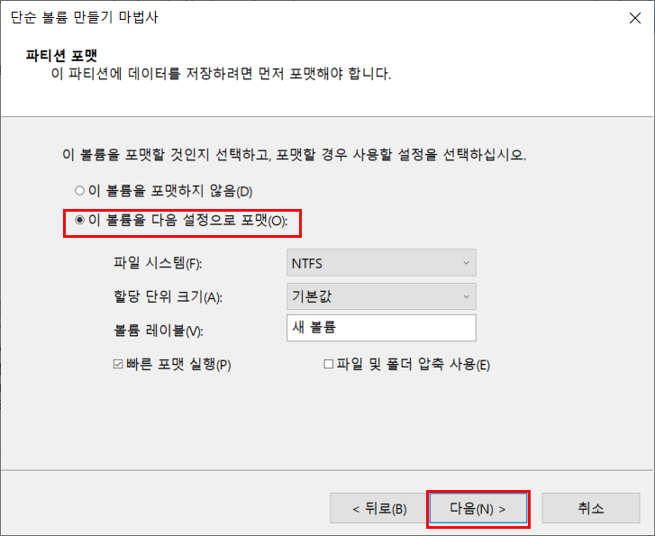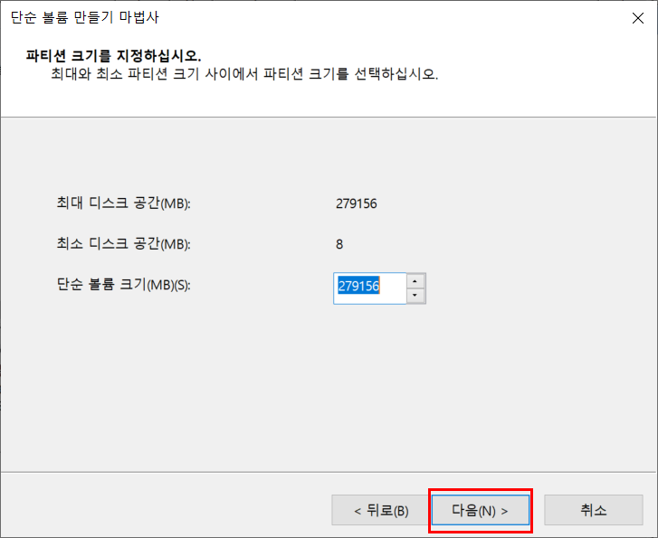 20. 그러면 단순 볼륨 만들기 마법사가 시작된다. [다음]