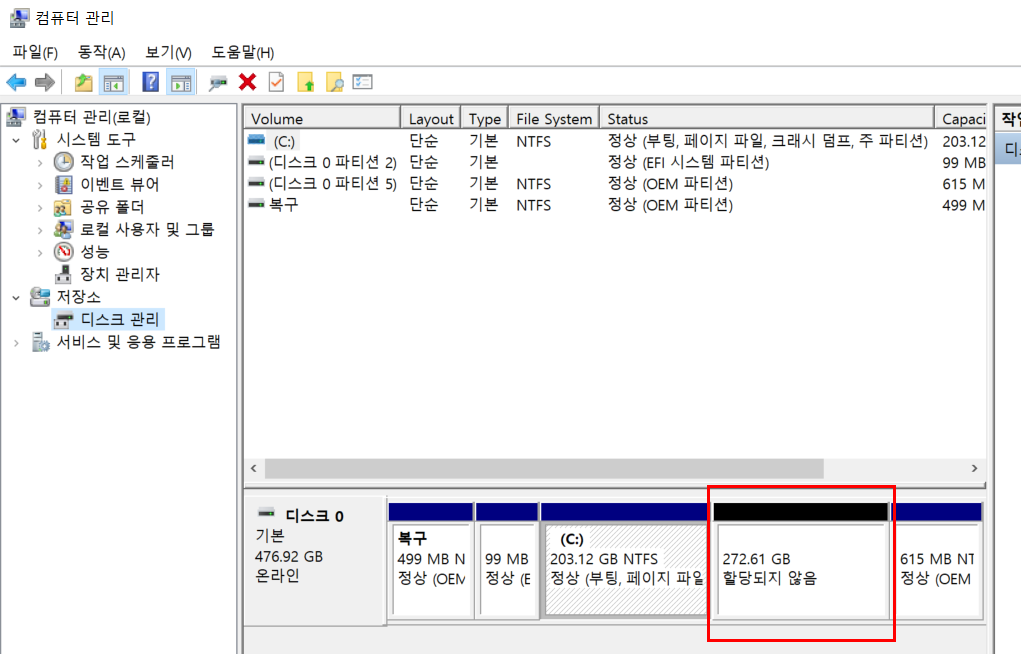 18. 컴퓨터 관리 - 저장소 - 디스크 관리 클릭하자.